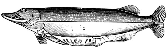 Fig. 34 — Diagram of pike, showing skin removed on one side from lower half of body. *