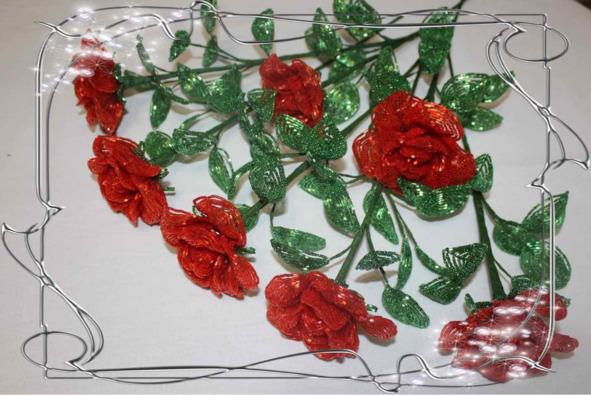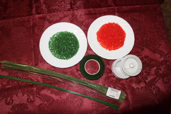 Материалы: рубка красная, рубка зелёная, тейп-лента, проволока флористическая 0,8, проволока зелёная 0,4, проволока красная 0,3 и 0,4, проволока 4 мм. алюминиевая (для стебля), клей Титан, фетр красный, нитка зелёного цвета (можно ирис).