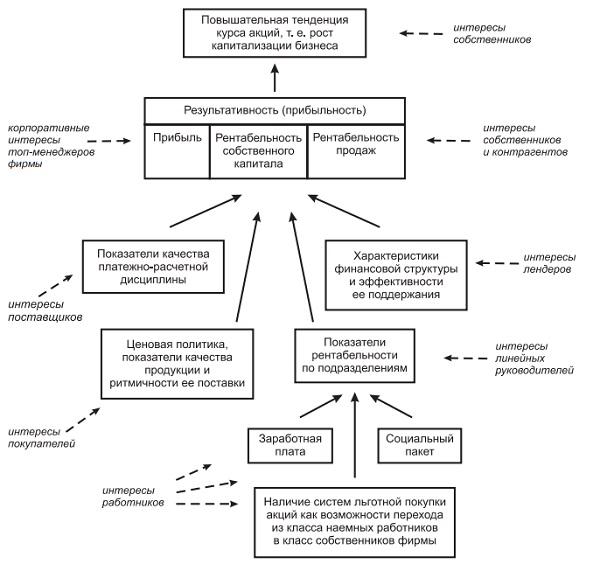 Иерархия целей. Согласование интересов различных групп и нивелирование возможных противоречий между ними достигаются: 1) формулированием четких целей; 2) их упорядочением и согласованием по временной (стратегический, тактический и оперативный аспекты) и структурной (центры ответственности) составляющим; 3) разработкой мер по обеспечению конгруэнтности целевых установок, являющихся ключевыми для заинтересованных лиц. Многоаспектность и множественность целевых установок, как правило, приводят к необходимости построения дерева целей, что обеспечивает согласованность и соподчиненность целей24. Один из вариантов иерархической упорядоченности целей заинтересованных лиц представлен на рис. 2.1. Многие из приведенных целевых установок могут быть выражены количественными индикаторами.