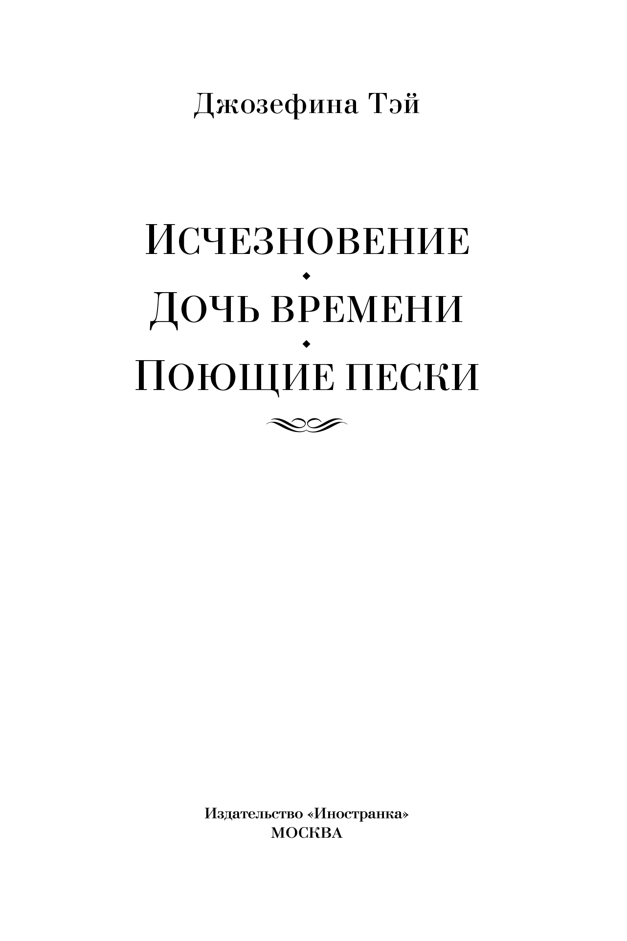Исчезновение ; Дочь времени ; Поющие пески : романы / Джозефина Тэй ; пер. с англ. Ж. Грушанской, А. Санина, Ю. Смирнова. — М. : Иностранка, Азбука-Аттикус, 2023. — (Иностранная литература. Классика детектива).