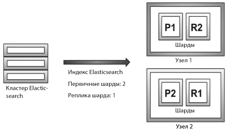 На рисунке выше показан кластер с узлом 1 и узлом 2. На узле 1 находятся шарды P1 и R2, а на узле 2 — шарды P2 и R1. P обозначает первичные шарды, а R — шарды-реплики.