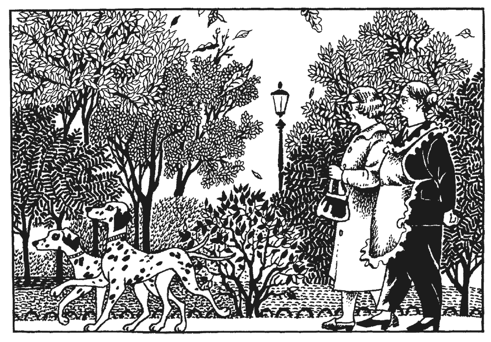 Шли они так. Впереди двигались Душечки – миссис Душечка, в очень красивом развевающемся зеленом костюме, купленном в приданое, и мистер Душечка, в специальном собачьем прогулочном твидовом пиджаке. (Лицо у мистера Душечки было не слишком красивое, зато смотреть на него никогда никому не надоедало.) Следом шагали Понго и Миссис – оба великолепные, оба заслуживавшие золотых медалей, которые они наверняка получили бы, если бы мистер Душечка не считал выставки процедурой чрезвычайно утомительной для собак, ну и для него, разумеется, тоже. У обоих были крупные головы, мощная грудь, сильные ноги и прямые хвосты. Пятна у них были все яркого черного цвета, на голове, ногах и на хвосте маленькие, а на боках и спине с двухшиллинговую монету. Нос и очки вокруг глаз тоже были такие же черные. Миссис шла с очень важным видом. А у Понго вид был такой, как всегда, – будто он вот-вот напроказничает, хотя Понго уродился на свет до того умным, что вполне мог бы руководить даже людьми. Тем не менее он, как и Миссис, вел себя с большим достоинством, и оба они позволяли Душечкам браться за поводки только на перекрестках. Завершали процессию Нанни Повар (толстенькая) в своем белом рабочем халате и Нанни Мажордом (потолще) в отлично сшитом смокинге, в брюках и тончайшем переднике с рюшечками.