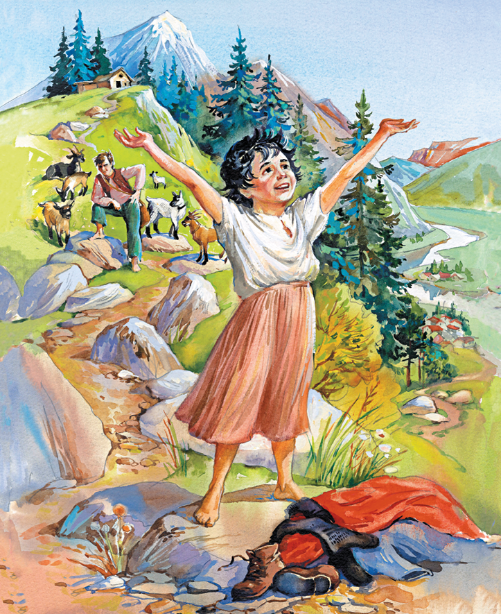 По этой узкой горной тропе поднималась в предгорья ясным июньским утром рослая и крепкая девушка, ведя за руку ребёнка, щёки которого пылали так, что румянец пробивался даже сквозь тёмный загар. И неудивительно: ребёнок, несмотря на жаркое летнее солнце, был так закутан, будто ему предстояло выйти на лютый мороз. С виду девчушка не доросла и до пяти лет; о комплекции её судить было трудно, поскольку на неё надели две, если не три одёжки, а поверх одёжек ещё крест-накрест обвязали большим красным платком, так что она представляла собой бесформенную груду, которую воткнули в два тяжёлых, подбитых гвоздями башмака и заставили карабкаться в гору, пыхтя и полыхая жаром. Они уже с час шагали из долины в гору, когда добрались до деревушки, что располагалась на полпути до горных пастбищ – альма – и так и называлась: Деревушка. Тут идущих стали окликать едва ли не из каждого двора – то из окна, то из дверей, а то с дороги, ведь девушка пришла в своё родное селение. Однако же она нигде не замедлялась, на ходу отвечая на приветствия и вопросы, и не остановилась, пока не дошагала до последнего домика на отшибе. Тут ей крикнули из дверей: