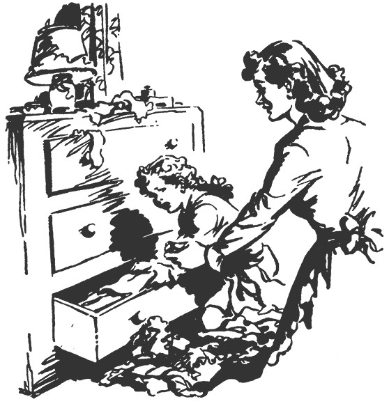 – Где мой значок?! Где мой значок?! – повторяла Джанет. – Я помню, что положила его вот в этот ящик. – Из ящика полетели в воздух носовые платки, носки, ленты...