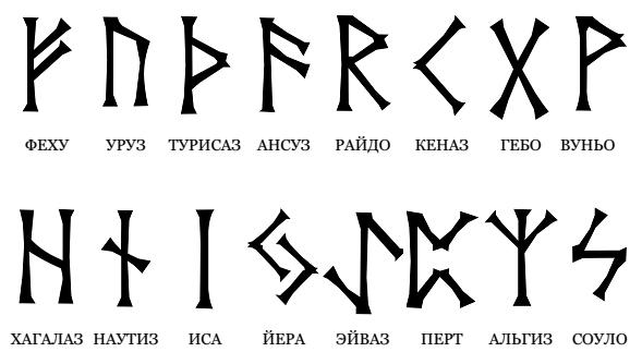 По официальной версии, как уже говорилось, руны – это алфавит древних германских племен, вырожденный из северо-италийского алфавита. Предположение, надо сказать, небезосновательное. Во-первых, рунические символы очень похожи на буквы этого алфавита. Во-вторых, у варварских племен вряд ли была своя письменность, и предположение о том, что они переняли ее у соседней древнеримской цивилизации, с которой постоянно контактировали, кажется разумным. В-третьих, археологи обнаружили далеко не один артефакт с руническими надписями. Сомнений в том, что руны – это именно алфавит, ни у кого не должно возникнуть. Собственно, свое название Старший Футарк[1], самый древний из известных нам рунический строй, получил по первым шести символам: руна Феху (обозначающая звук «ф»), руна Уруз (звук «у»), руна Турисаз (звук «тх»), руна Ансуз (звук «а»), руна Райдо (звук «р») и руна Кеназ (звук «к»).