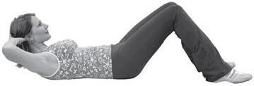 1. Лягте на коврик, на спину. Согните ноги в коленях, руки за головой, локти в стороны, подбородок опущен к груди. Стараясь не напрягать мышцы шеи, выполняйте подъемы верхней части туловища (фото 1).