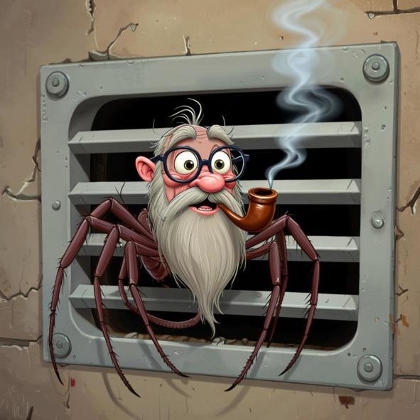 Вскоре послышался тихий шорох. Из вытяжки показалась голова паука-философа Филонора. Он выглядел как профессор из старого мультфильма: круглые очки, длинная борода и трубка в лапках, из которой поднимался небольшой дымок.