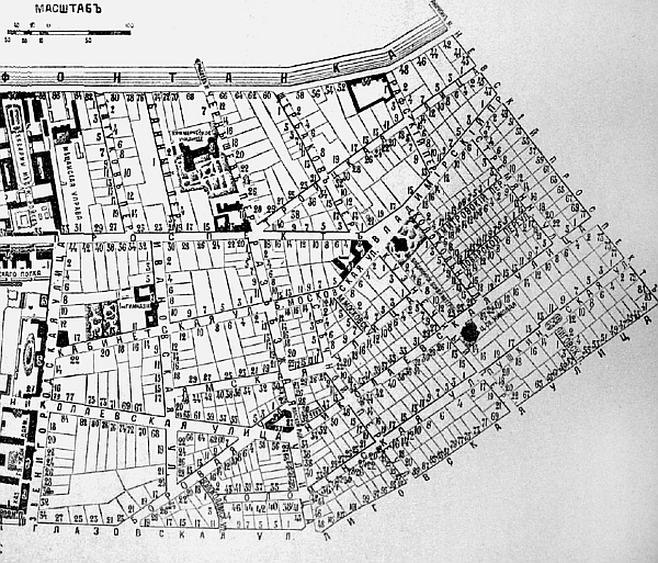 На приведенной схеме между домами № 7 и № 9 вместо ошибочно указанного Свечного переулка должна быть Малая Офицерская улица. Свечной переулок находился между домами Турчанинова и Бинберга. Близкая к современной нумерация домов по Большой и Малой Московским улицам сложилась после перемены в 1855 г. четности сторон петербургских улиц и присвоения уличного номера церковному дому.