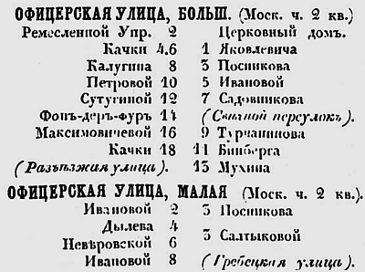Адресная книга «Путеводитель 60 тысяч адресов из Санкт-Петербурга…» в 1854 г. (до изменения четности сторон улиц) приводит следующий список домовладельцев на Большой и Малой Офицерских улицах.