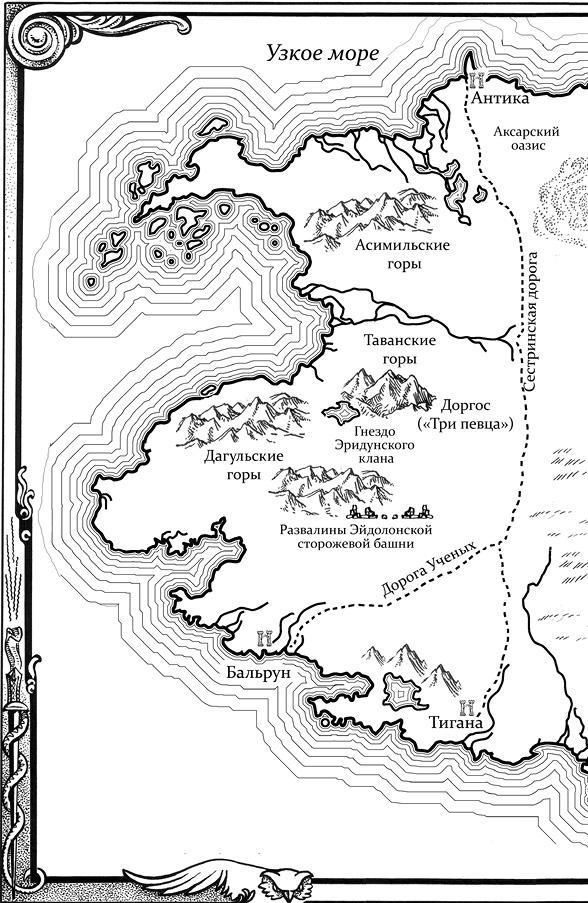 Мозаичные картины, вкрапленные между зеленым мрамором пола, создавали ремесленники Тиганы — весьма ценимого хаганом города на южной оконечности континента. Каждая представляла сцену из богатой событиями, жестокой и славной истории хаганата. Начало ее тонуло во тьме веков, когда далекие предки хагана веками кочевали по травянистым степям восточной части континента. Мозаики запечатлели появление первого хагана — военачальника, который объединил разрозненные племена, сделав их народом-завоевателем. С тех пор начался последовательный захват континента. Шаг за шагом, сочетая военную силу с проницательностью и умением мыслить стратегически, государство бывших кочевников превращалось в обширную империю. История последних трех веков представала в деяниях хаганов. Они продолжали дело предков, расширяя границы империи. Хаганы распределяли богатства, стекающиеся отовсюду, строили бесчисленные мосты и дороги — кровеносные артерии громадного континента, которым они управляли с ясным пониманием цели и точностью действий.