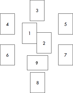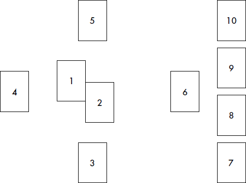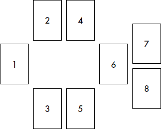 6. Разложите Арканы лицевой стороной вниз в соответствии со схемой расклада. Карты вытаскиваются из колоды наугад.