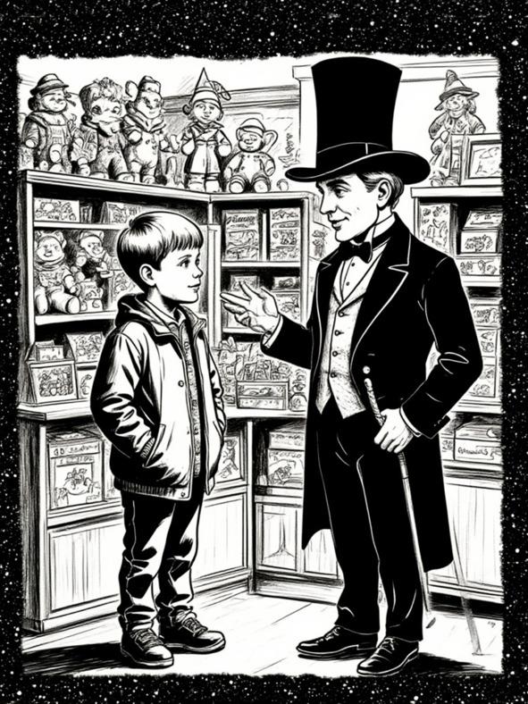 Фима остановился. Слова эти произвели на него сильное впечатление. Фима поднял глаза и увидел странного человека в чёрном цилиндре, фраке из тёмно-синего бархата с ласточкиным хвостом, идеально отглаженных брюках и лаковых туфлях. В руке он держал трость с золотым набалдашником. Подбородок его украшала маленькая, аккуратно подстриженная бородка. Всё его лицо светилось добротой и радостью.