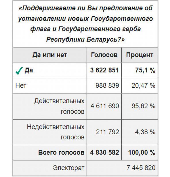 Но после референдума 14 мая 1995 года, инициированного первым президентом Республики Беларусь Александром Лукашенко, или спустя почти семь лет после начала так называемого «Адраджэння» / «Возрождения нации» по бело-красно-белому варианту, постсоветская посткоммунистическая власть РБ по-своему вернула белорусскому государству бывший в БССР красно-зелёный / чырвона-зялёны (ЧЗ) стяг, чуть-чуть изменив его. Вот результат референдума, согласно опубликованным данным Центральной избирательной комиссии: за ЧЗ стяг отдан 3 622 851 голос граждан из числа 7 445 820 тогдашнего электората или менее половины голосов избирателей.
