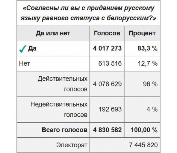 Вторая итоговая картинка говорит о том, что тогда же, 14 мая 1995 года, белорусский народ проголосовал за то, чтобы белорусская мова имела равный статус с великим и могучим русским языком: