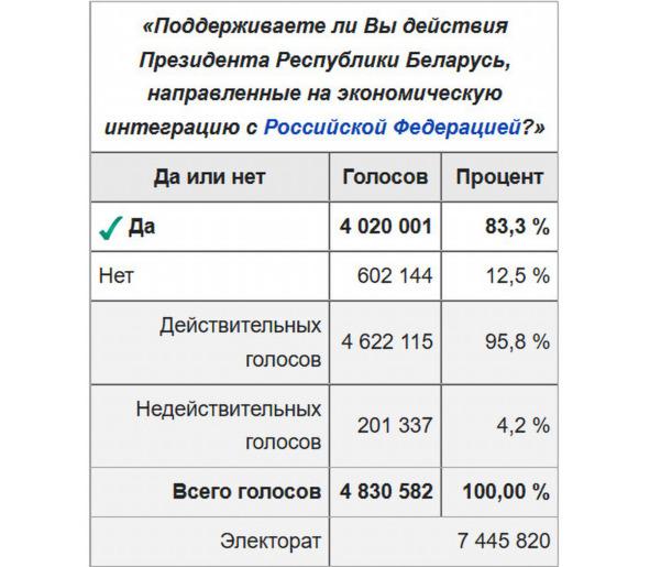 Третья итоговая картинка говорит о том, что 14 мая 1995 года большинство избирателей поддержало известные им до голосования действия Президента, направленные на экономическую интеграцию с Россией. Полагаю, поддержали потому, что слова «экономическая интеграция» в тот день были исконно белорусские и потому понятны моим постсоветским соплеменникам. Правда, я не проверял версию. Зато, судя по итогам референдума-1995, избиратели знали значение слов «экономическая интеграция» и не перепутали со смыслом слов «референдум о Союзе РБ и РФ», которого в РБ никто не проводил.