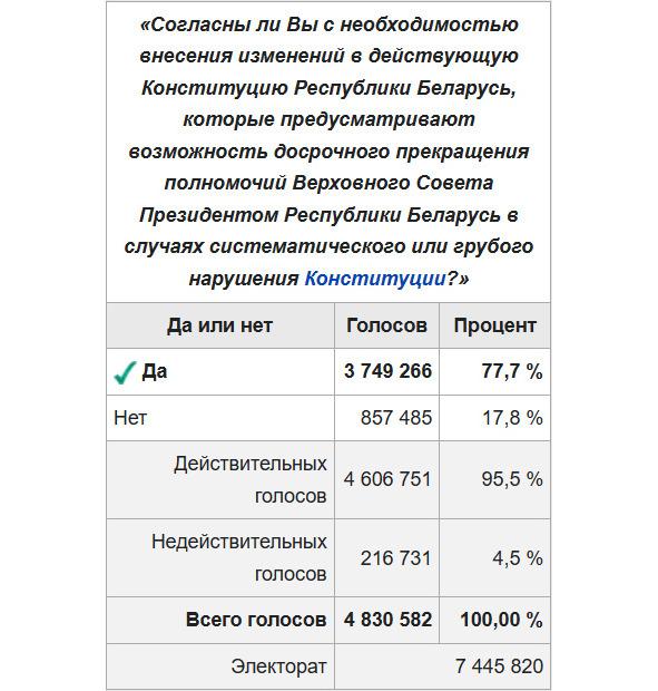 И наконец четвёртая картинка из «Википедии» должна быть здесь, потому что на референдуме 14 мая 1995 года было четыре вопроса. Она без моего комментария, так как в ней всё сказано ЦИК и властью:
