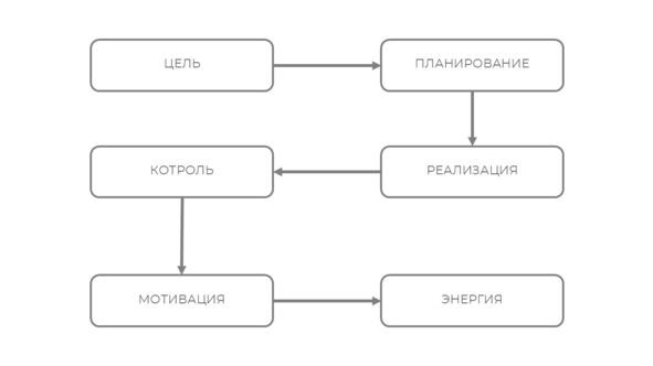 Всё начинается с цели. Дальше идёт планирование. После понимая стратегии нужно её реализовать, дальше — контролировать себя и команду, понимать, где находимся. В ходе работы может случиться так, что у некоторых (включая и вас) пропадёт мотивация, поэтому рассмотрим мотивацию. Последним пунктом рассмотрим энергетические ресурсы и те аспекты, которые могут влиять на достижение цели.
