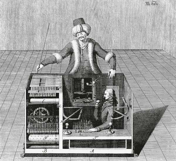 В 1769 году государственный служащий империи Габсбургов по имени Иоганн Вольфганг Риттер фон Кемпелен создал устройство, прозванное механическим турком. Этот подарок должен был произвести впечатление на императрицу Священной Римской империи Марию-Терезию Австрийскую. Почти что волшебная машина фон Кемпелена умела играть в шахматы и побеждать человека – всего лишь с помощью внутренних шестеренок и ремней. Как видно на исторических гравюрах, механический турок представлял собой большой деревянный ящик шириной около четырех футов, глубиной два с половиной фута и высотой три фута[1]; за его дверцами можно было разглядеть сложный внутренний механизм. Сверху располагался человекоподобный автомат: над шахматной доской наклонялась фигура размером с ребенка – халат, тюрбан, впечатляющие усы (этот ориенталистский архетип объединял в глазах европейцев чужака-человека и чужака-машину). Турок протягивал над доской левую руку, брал фигуры и передвигал их. Машина сигналила после сделанного хода, определяла, когда противник жульничает, а лицо автомата могло менять выражение. Механический турок фон Кемпелена настолько всех одурачил, что во время своих путешествий по миру сразился с Бенджамином Франклином в 1783 году и Наполеоном Бонапартом в 1809 году. Оба ему проиграли.