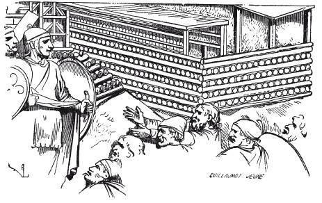 Для того чтобы этот отрывок был понятнее, мы приводим на рис. 12 разрез башни (или бастиона), которую описывает Цезарь. На рисунке изображен момент, когда римские солдаты поднимают ее крышу. Она поднимается с помощью больших деревянных винтов, установленных в четырех углах башни. Эти винты поворачиваются с помощью больших рычагов и гаек и опираются на первые боковые балки каждого этажа и на угловые башни. Таким образом, винты не имеют конца, ибо, когда их нижний конец выходит из гайки нижнего этажа, их верхний конец уже попал в гайку последнего этажа. В винтах просверлены отверстия, куда вставляются палки-рычаги, с помощью которых шесть человек поворачивают этот винт. Когда крыша поднята, каменщики в нескольких местах подпирают ее и выравнивают. С выступов балок крыши свешиваются ковры из канатов, которые защищают рабочих. Что касается крысы укрытия, позволяющего солдатам расшатывать основание стен осажденного города, то ее описание настолько ясно и подробно, что не нуждается в комментариях.