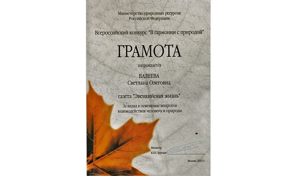 Министерство природных ресурсов Российской Федерации провело в этом году Всероссийский конкурс среди журналистов и фотожурналистов печатных и Интернет-изданий на лучшую публикацию и фотографию «В гармонии с природой» в целях привлечения общественного внимания к вопросам взаимодействия человека и природы, ресурсосбережения, сохранения природного разнообразия, а также поддержки журналистов и фотокорреспондентов, освещающих эти вопросы. В конкурсе приняли участие десятки различных изданий и сотни журналистов. От газеты «Эвенкийская жизнь» свои силы решила попробовать ответственный секретарь Светлана Олеговна Романовская (Валеева), отправившая на конкурс цикл публикаций об эвенкийской тайге, о взаимодействии с ней. И вот недавно жюри подвело итоги и объявило победителей. В числе награжденных значится и Светлана Олеговна Романовская (Валеева) — цикл ее публикаций об эвенкийской тайге, взаимодействии с ней человека отмечен Грамотой Министерства природных ресурсов — «За вклад в освещение вопросов взаимодействия человека и природы».