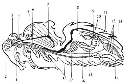 Внутренние органы пчелы: 1 – верхнечелюстная железа; 2 – глоточная железа; 3 – надглоточный узел (мозг); 4 – задняя ветвь глоточной железы; 5 – грудная железа; 6 – яйцевод; 7 – аорта; 8 – спинная диафрагма; 9 – мальпигиевы сосуды; 10 – камеры сердца; 11 – толстая кишка; 12 – ректальные железы; 13 – прямая кишка; 14 – жало; 15 – средняя кишка; 16 – брюшная диафрагма; 17 – медовый зобик; 18 – нервная цепочка.
