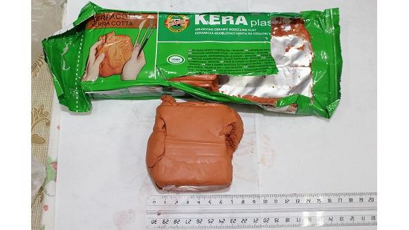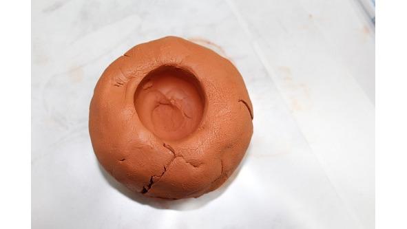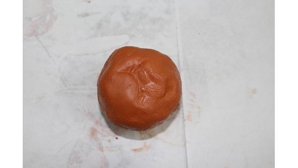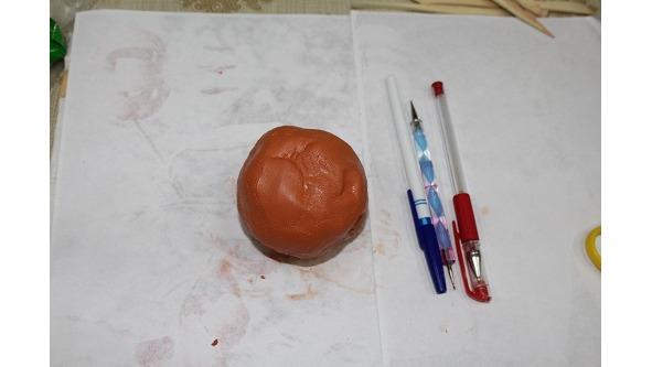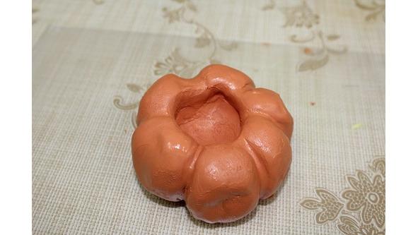 Начинаем с лепки вазочки, она у нас будет в форме маленькой тыквы с крышечкой. Пачки глины стандартные, на фото видно какой примерно кусок нужен для лепки для большего удобства и наглядности лежит рядом линейка. Катаем шарик и проделываем углубление в середине, я взяла клей карандаш (большой). Надавливаем делая нужное углубление в 1,5—2 см., при надавливании шар становится немного плоским и трескается по краям, ничего страшного, берём карандаш, ручку или фломастер и его боком продавливаем ямки на местах раскола, тем самым придаём форму тыквы, края неровные, поэтому смачиваем руки и сглаживаем мокрыми пальцами неровности.