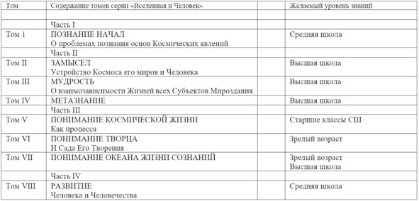Для того чтобы упростить восприятие материала, автор сгруппировал текст в виде 8-ми томов серии «ВСЕЛЕННАЯ И ЧЕЛОВЕК», совместно составляющих единое цельное «ПОСЛАНИЕ НОБЕОЛВЫ». Каждый том охватывает свой круг рассматриваемых вопросов и имеет свой аспект изложения: