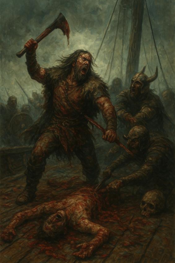 Драккар ответил вздохом, долгим, сытым, из всех сучков и швов сразу. Паруса вздулись ещё сильнее, натягивая лица на бортах до предела: кожа затрещала, обнажая зубы в безмолвных улыбках. Носовая фигура — лицо врага, чьи глаза ещё вчера были пустыми, — моргнула. Один раз. Медленно.