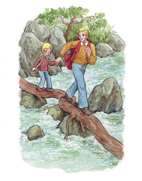 Они двигались шаг за шагом, Каос смотрел на папин рюкзак и иногда проверял, правильно ли он ставит ногу. Уф, вот они и добрались до другого берега! Теперь он снова на твёрдой земле и может сколько угодно глядеть на резвящуюся реку.