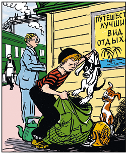 – Мик, вот тебе деньги. Сбегай к киоску и купи мне газету «Известия», – сказал Петя и протянул ему монетку. Мик схватил её зубами и выпрыгнул через окно на перрон.