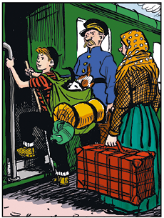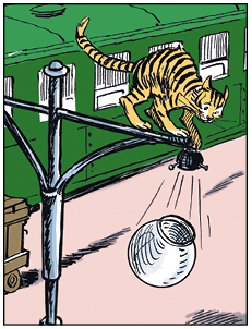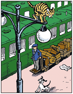 В то мгновение Мик отвлёкся от кошки и не смотрел вверх. Он оглянулся на поезд. Паровоз дал короткий гудок, а вагоновожатые, стоявшие у дверей каждого вагона, покрикивали: «Провожающие! Пожалуйста, покиньте вагоны! Поезд скоро отправляется».