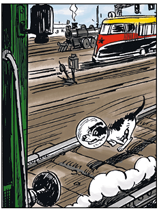 А вот Мук сразу понял, в чём дело. Его отличный слух и хорошее чутьё подсказали ему, что где-то там, на перроне, его приятель просто гонялся за кошкой! А сейчас загнал эту кошку на фонарный столб, сидит под этим столбом и тявкает.