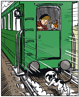 А в купе поезда волновались Петя и Мук. Они поняли, что Мик опоздал, и побежали через весь состав в конец поезда. Из окна последнего вагона они увидели отставшего Мика, бегущего по шпалам.