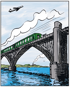 Поезд продолжал неспешно ползти по красивому мосту. В небе летел самолёт. По реке проплывали лодки и кораблики. На противоположном берегу раскинулись поля, а за ними какой-то маленький завод. Из заводской трубы клубами поднимался пар, точь-в-точь как из трубы паровоза, который всё дальше и дальше убегал от Мика.