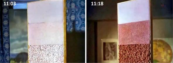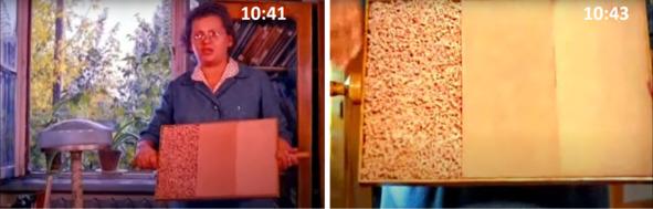 На кадре 11:03 освещенность всех трех образцов, которые окрашены в один и тот же цвет, выглядит одинаково. Потом происходит поворот учебного пособия, когда меняется освещенность лотка. На кадре 11:18 хорошо наблюдается различие освещенности трех образцов. Гладкий образец выглядит более светлым, чем образцы шероховатый и ноздреватый.