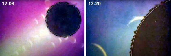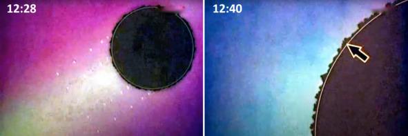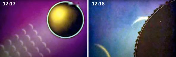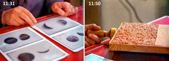 Оказалось, что лунная поверхность ведет себя как этот образец: Кадр 11:50. Лунная поверхность сильно изрыта и ноздреватая. Поверхность же американской «Луны» выглядит слегка шероховатой, покрытой мелкозернистым песком серого цвета. Американская «лунная поверхность» местами покрыта мелкой пылью, что делает такую поверхность, похожей на образец сотрудницы харьковской обсерватории Федорец В. А. справа, с ровным покрытием с малой шероховатостью. Геологам, которые знают геологию, хорошо известно, что большие отложения песка образуются в результате интенсивной водной эрозии, это места прохождения потоков воды, рек и ручьев. На реальной Луне должен быть другой грунт. И это не песок!