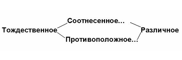 При этом один из аристотелевских видов противолежания — «противоречащее» — мы разделили на две части — на два совершенно самостоятельных сравнительных понятия: «Тождественное»: А = А. И «Различное»: А и не-А. Тогда как три других вида противолежания: «соотнесенное», «лишенность и обладание» и «противоположное», напротив, объединили в один вид, вводя для него общий термин — «градуальное».