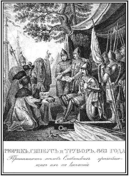 Рурик, самодержавства российского основатель и праотец многих государей, по прошению славян и чуди пришел к ним на княжение с двумя братьями, со всем родом и с варягами-россами[1]. К пребыванию сперва избрал Ладогу, хотя новгородские славяне были главные его просители и великость города больше приличествовала к столице. Посему кажется, что Рурик на слове их не совсем утверждался, ведая происходившие между ними межусобия. Ладога для всегдашнего проезду славян, варягов и чуди удобность подавала примечать движения недоброхотов его в Новегороде. Середний брат Синеус сел княжить на Беле-озере; меньший, Трувор, в Изборске.