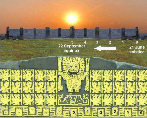 По расчетам Эдмунда Кисса, Тиуанако был построен приблизительно за 27000 лет до Рождества Христова [245]. По версии Познанского, это был солнечный календарь. В нем не только начало года привязывалось к моменту равноденствия, но также было обозначено второе равноденствие и дни солнцестояния. В этом календаре было одиннадцать месяцев по тридцать дней (количество крылатых спутников бога над меандром) плюс «большой месяц» из тридцати пяти дней, месяц Виракочи, в сумме составляющие 365 дней солнечного года [247].