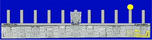 Солнце смещается влево и через 5 столбов или через три месяца достигает центральной колонны, отмечая равноденствие 22 сентября. Каждый столб на стене соответствует одной из икон на Воротах Солнца.