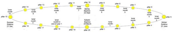 Когда Солнце достигло первого столба, оно прошло бы 1/20 солнечного года, что составляет 18,26 дня. К тому времени, когда он достигнет середины пути к следующему столбу, он снова должен был бы проехать вдвое меньше, что при добавлении к первой цифре означает, что прошло бы 27,39 дней — практически сидерический лунный месяц — каждые полтора столба добавили бы еще один сидерический месяц и продолжение процесса вернет нас к центральному столбу после того, как пройдет 13 и третий такой звездный лунный месяц (или деление), завершив солнечный год и сделав его двойным, солнечно-лунным календарем.