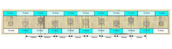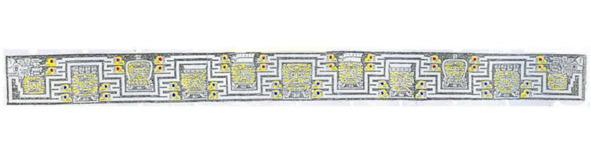 Длина фриза указана Беллами как 100 дюймов, она изображена в очень правильном дизайне с маленькими иконками с интервалами в 14 шуши (28 ячменных зерен), в то время как меандр кажется запланированным с чередующимися интервалами в 12 и 16 шуши (или 24 и 32 ячменя), и маленькие значки, кажется, содержатся в прямоугольниках 6 дюймов в высоту и 5 дюймов в ширину (или 12 x 10 простых единиц ½»).