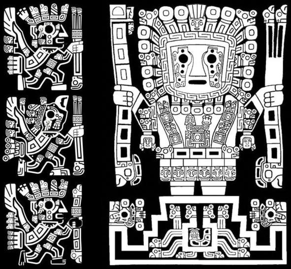 Изображениях Верховного Бога (Виракочи), а также его пернатых божеств или крылатых спутников на Вратах Солнца в Тиуакане состоят из множества определенных элементов, в виде геометрических фигур. Впервые это определил Артур Познанский, он выполнил серьезную работу по изучению этих элементов, встречающихся и на других памятниках [19]. Он классифицировал их в соответствии с изображенным объектом (животное, рыба, глаз, крыло, звезда и т.д.) или понятием (Земля, небо, движение и т.д.). Познанский первым выяснил, что круги и овалы всевозможных цветов и размеров служат для обозначения Солнца, Луны, планет, комет и других небесных тел (рис. 32а), что на барельефе часто встречается отображение связи Небо–Земля (рис. 32b) и что доминирующими символами являются крест и ступени (рис. 32с). В последнем элементе, лестнице, он усмотрел «фирменный знак» Тиуанако — его памятников и всей цивилизации, — откуда этот символ распространился по всей Америке. Он признал, что этот знак напоминает зиккураты Месопотамии, но поставил под сомнение возможность присутствия шумеров в Тиуанако [19]. Все эти особенности усиливали ощущение Познанского, что Врата Солнца являются частью большого комплекса в Тиуанако, который выполнял функцию обсерватории.
