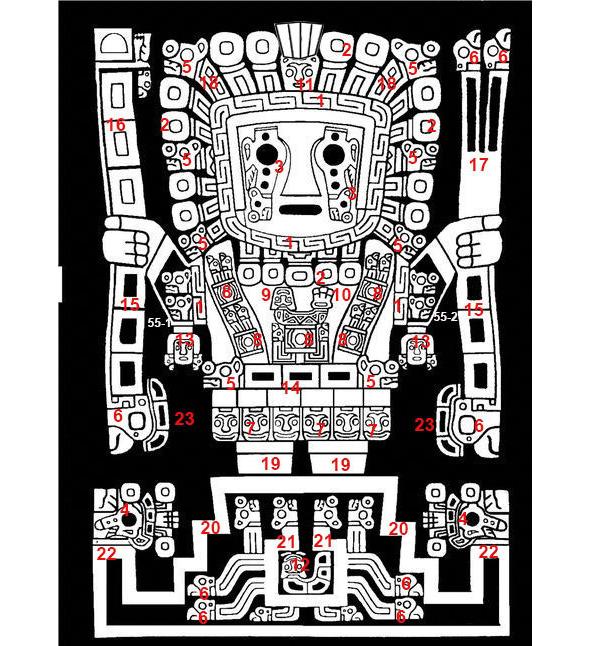 систему; 11 — ближайшая к Солнцу планета — Меркурий; 12 — аналог 9 и 10 — Венера — комета, разрушитель, на поверхности тела — семь треугольников по числу эпох; 13 — спутники Марса Фобос и Деймос; 14 — три зачерненных прямоугольника для подсчета синодической орбиты Венеры; 15, 16 и 17 — зачерненные и белые прямоугольники в жезле — для полсчета орбиты Марса при наличии и отсутствии катастрофы; 18 — сдвоенные прямоугольники для подсчета орбиты разных Лун; 19 — две опоры Верховного Бога; 20 — ступени пирамиды, символизирующие ступени развития и катастроф; 21 — зона, которую следует изолировать, в этой области показана первоначальная планета — разрушитель; 22 — выступы или опора для Луны; 23 — по три зоны над кондором, изображающим Марс, для подсчёта времени орбиты.