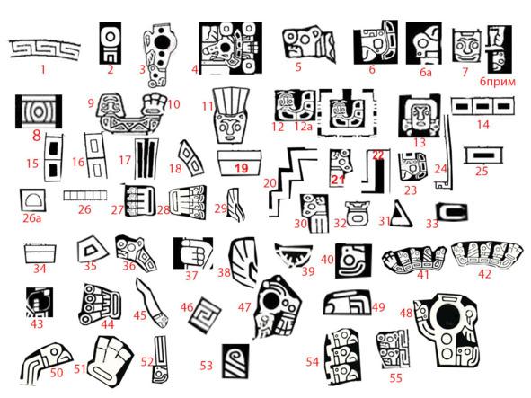 1 — символ меандр, дни года; 2 — две концентрические окружности — лунные дни; 3 — Земля со спутниками (которые были раньше), 4 — Земля и разные Луны (Лея, Фатта, Месяц), 5 — ягуар и детали для подсчета орбиты Меркурия; 6 — Марс со спутниками, 6а — кондор; 6 прим — примечание для високосного года; 7 — Уран со спутниками, 8 — Венера, для подсчета орбиты; 9 и 10 — Венера — комета, разрушающая систему, на поверхности тела — семь треугольников по количеству эпох; 11 — ближайшая к Солнцу планета — Меркурий; 12 — аналог 9 и 10 — Венера — комета, разрушитель; 13 (13А и 13Б) — спутники Марса Фобос и Деймос; 14 — три зачерненных прямоугольника для подсчета синодической орбиты Венеры; 15, 16 и 17 — зачерненные и белые прямоугольники в жезле — для подсчета орбиты Марса в периоды до и после катастрофы; 18 — сдвоенные прямоугольники для подсчета орбиты; 19 — две опоры Верховного Бога; 20 — ступени пирамиды, символизирующие ступени развития и катастроф; 21- зона, участвующая в катастрофе; 22 — выступы или опора для Луны, соответствующие определенной эпохе; 23 — аналогично 6 с добавлением трех зон над кондором, изображающим Марс, для подсчёта времени орбиты; 24 — белая узкая полоска для подсчете времени обращения спутников Марса; 25 — прямоугольник зачерненный — одна из зон для подсчета синодической орбиты Венеры после катастрофы; 26 — прямоугольник белый — одна из зон для подсчета синодической орбиты Венеры до катастрофы 26а — половинка; 27 — Юпитер с четырьмя спутниками в период до катастрофы; 28 — Юпитер с четырьмя спутниками в период после катастрофы; 29 — Сатурн со спутниками, число которых равно количеству перьев; 30 — после катастрофы, после воздействия кометы, признаком которой является расщепленный на три части хвост; 31 — нос Верховного Бога и одновременно деталь для подсчёта; 32 — ключ для начала подсчета долей для нахождения дней солнцестояния и равноденствия; 33 — рот Верховного Бога и одновременно элемент для подсчета; 34 — опора Верховного Бога из двух частей, элемент для подсчета; 35 — одна из фигур, играющая несколько функций: или для подсчета синодической орбиты, или для удвоения; 36 — ягуар и прямоугольные фигурки для подсчете орбиты разных Лун; 37 — рука Верховного Бога с четырьмя пальцами и одновременно учетверение для отдельных случаев; 38 — тоже, что и 28 — Сатурн; 39 — элемент полукруга с четырьмя выступами, имеющий несколько функций, в том числе, четыре эпохи по числу выступов и пятая эпоха — овал; 40 — образ кондора с «разбитой мордой» после катастрофы; 41 и 42 — короны пернатых божеств и одновременно указатель характера и эпох воздействия; 43 — зачерненная рука пернатого божества в нижнем ряду, где она не является признаком умножения по числу пальцев; 44 — Юпитер в период катастрофы с указанием на возникновение новых небесных тел (спутников); 45 — нападающий кондор в связке с Сатурном; 46 — отдельный символ меандра, а также положение Земли до катастрофы; 47 — процессы, происходящие с Землей и её спутниками при катастрофе; 48 — плачущий Верховный Бог получается потому, что создатели календаря в области глаз нарисовали кружочки или слезы от пропадающих Лун; 49 — ступня пернатого божества и одновременно элементы для подсчетов; 50 — кондор и полоска — часть системы, подвергающаяся нападению; 51 — расщепленный на три части хвост — признак нападения кометы; 52 — поверженн
