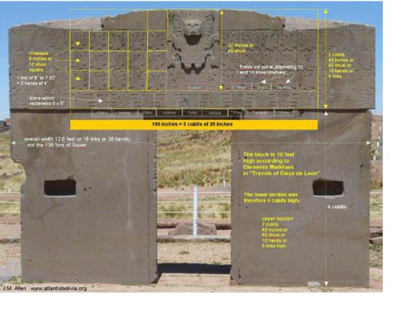 Выше, на детали «Ворот Солнца» в Тиуанако, Боливия, 30 иконок представляют 30 Солнечных лет, в то же время 20 иконок с человеческими головами, смотрящими вперед, представляют 20 лет из 20 звездных лунных месяцев и 10 часов с головами кондоров, смотрящими вверх, представляют 10 лет Акротома из 37 синодических лунных месяцев. В конце этого периода, который составляет 30 солнечных лет, 20 лет Зокама или 10 лет Акротома, к лунным календарям нужно было добавить 1 лунный месяц, чтобы вернуть их в фазу с солнечным годом [272].