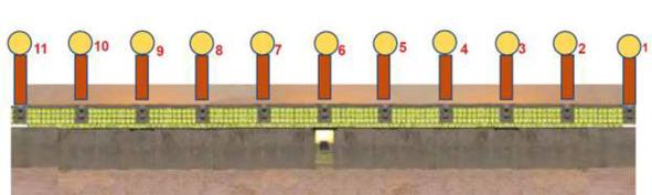 Рис. 31. Настоящий календарь Тиуанако –это Календарная стена, а Врата Солнца с фризом — только управление этим календарем. Рисунок автора, Александра Матанцева. Обозначения 1 — 11 — это положение Солнца в разные периоды времени над 11 колоннами Календарной стены