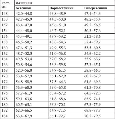 Итак, сначала давайте выясним, имеется ли у вас избыточный вес. Для этой цели было разработано множество систем и формул, однако современные диетологи предпочитаюттаблицу Егорова – Левицкого, согласно которой нормальный вес мужчин и женщин определяется с учетом их типа телосложения (табл. 1.1).