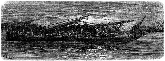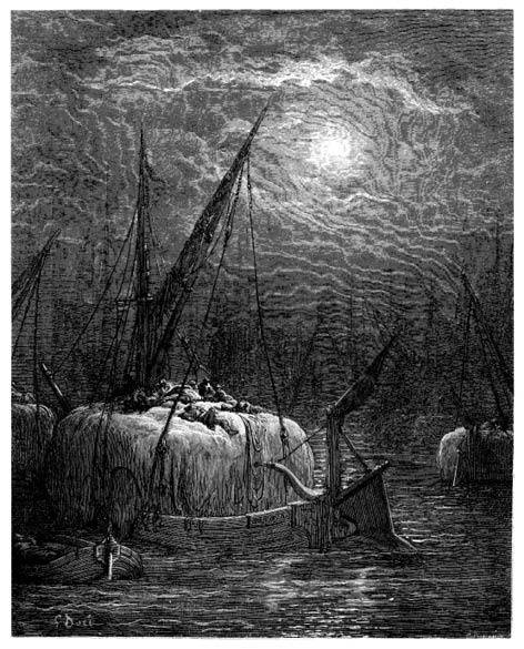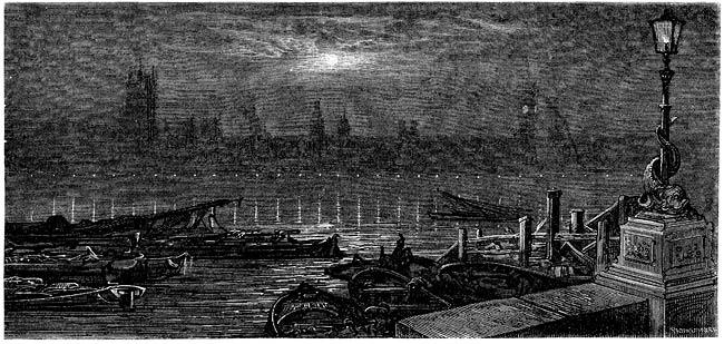 Англичане в своем патриотизме легко доходят до неумеренных восторгов и дифирамбов, когда надо восславить все, что касается их мужественной нации и ей принадлежит, и потому они расхваливают и воспевают Темзу на все лады. Поверить им, так она несравненна и на всем белом свете не сыскать такой прекрасной, большой и великолепной реки. По примеру римлян англичане охотно наделяют свою любимую реку отеческими правами. The Father Thames, Темза-батюшка — такое выражение часто слышится из уст лондонцев. Разным художникам нравится изображать the Father Thames — и именно так поступил Доре, готовя наш фронтиспис, — в облике величественного и почтенного старца, с микеланджеловским лбом, могучими плечами, бородой из тины, спускающейся волнами на широкую грудь, и мощной рукой, лежащей на кормиле судна. Люди с воображением, которые повсюду ищут совпадения, схожесть и символичность, нашли аналогии между обликом Темзы и духом англичан. И река представляется им, как и этот дух, сумрачной, глубокой и сильной.