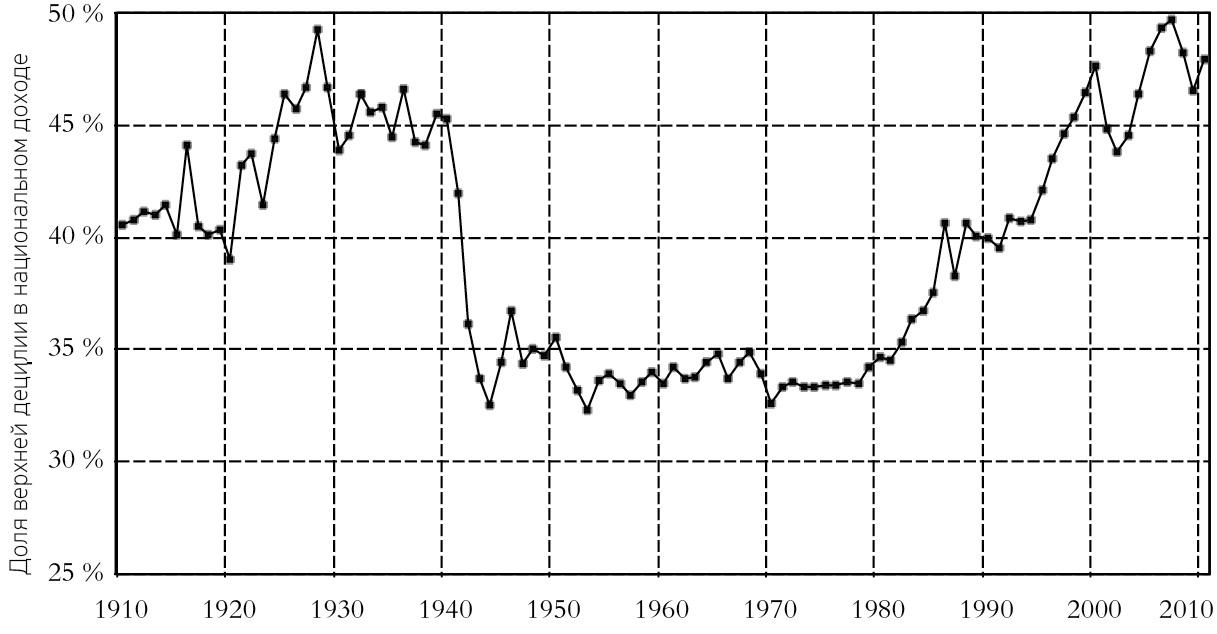 Примечание. Доля верхней децили в национальном доходе США сократилась с 45–50% в 1910–1920-е годы до менее чем 35% в 1950-е годы (это то самое снижение, которое измерил Кузнец); затем она поднялась с менее чем 35% в 1970-е годы до 45–50% в 2000–2010-е годы.